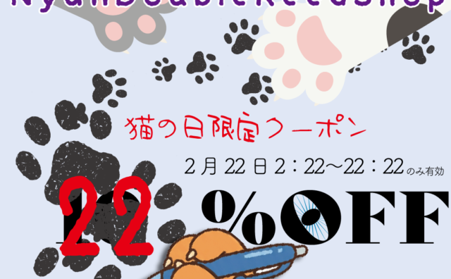 2月22日は猫の日!という事で、お店が1日限定NyanDoubleReedShopになります。 また、猫の日にちなんで、2月22日2時22分~22時22分(午前2:22~午後10:22)限定22%OFFクーポンを配布します。